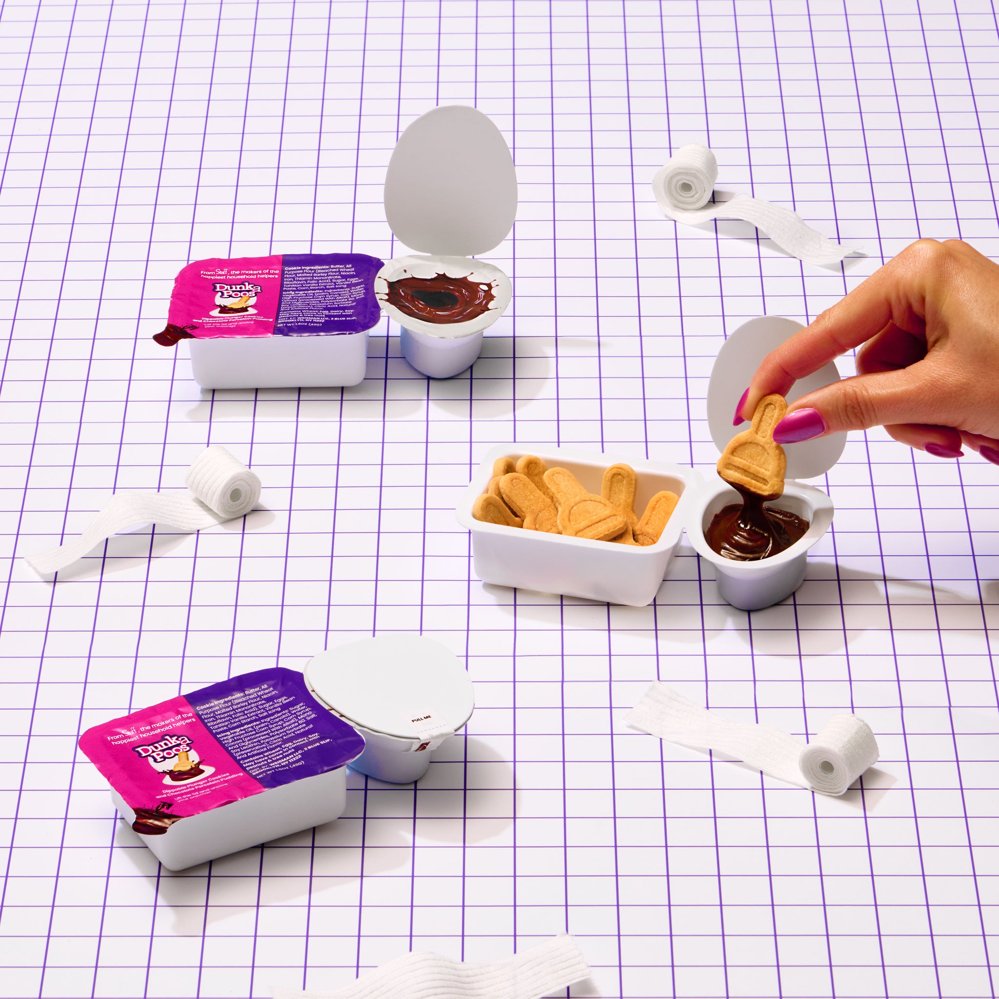Each set includes plunger-shaped cookies ready to dunk into rich chocolate icing, served in a mini toilet (lid and all). Equal parts absurd and delightful, DunkaPoos are designed to bring smiles.