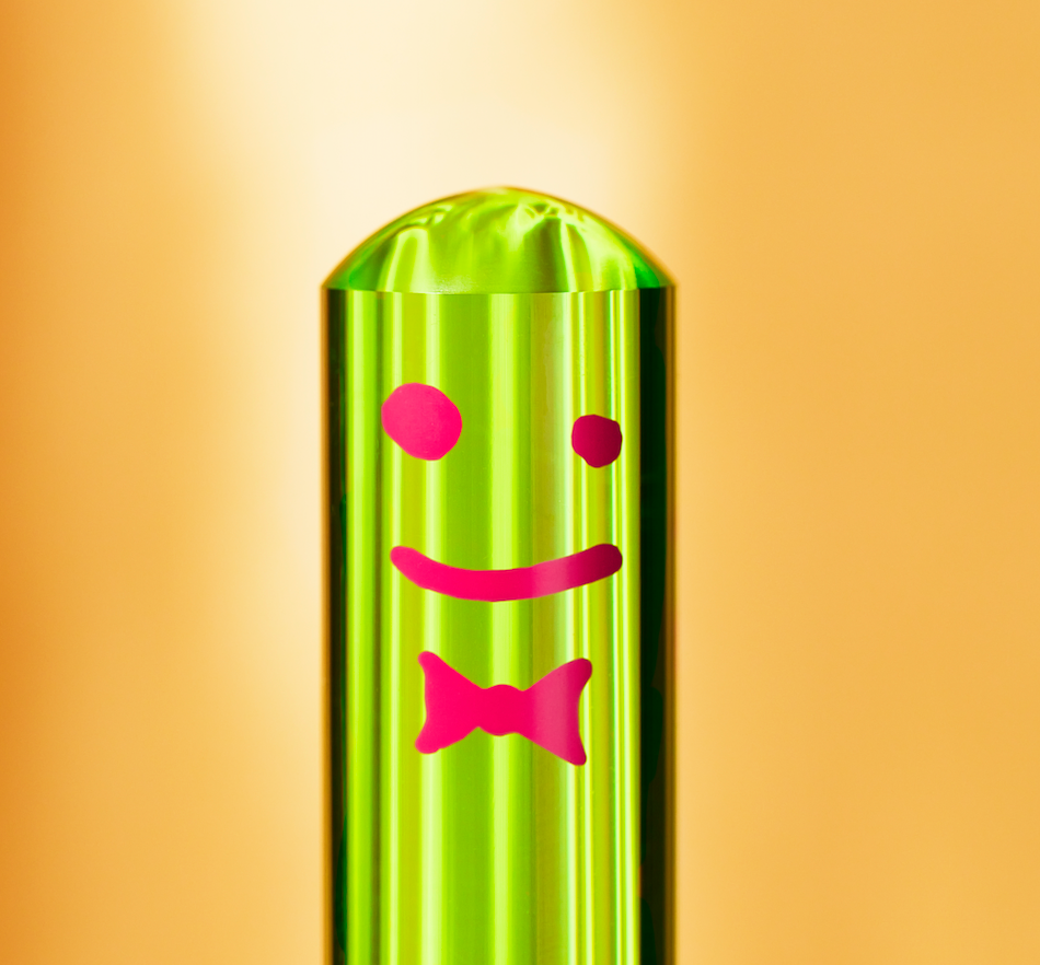 The Toilet Brush has a colorful translucent acrylic handle, signature Staff smiley, replaceable brush component, holding canister with sanitary air holes, and a bronze ring for a little extra shine.